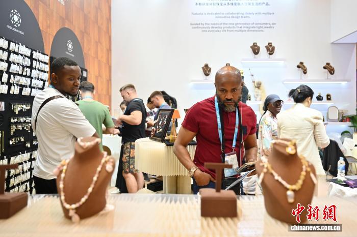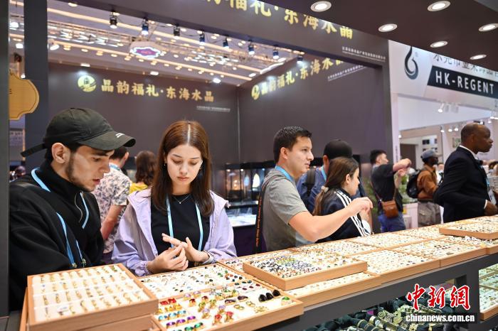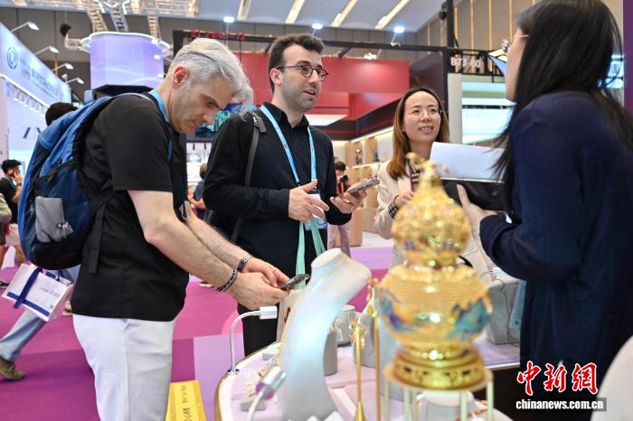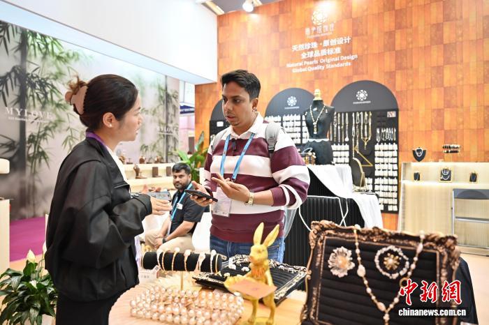 图为境中推销商正在前卫饰品博区战参铺商榷道。中新社记者 旧楚白 摄